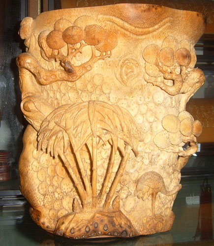 产品名:松竹图竹根雕笔筒