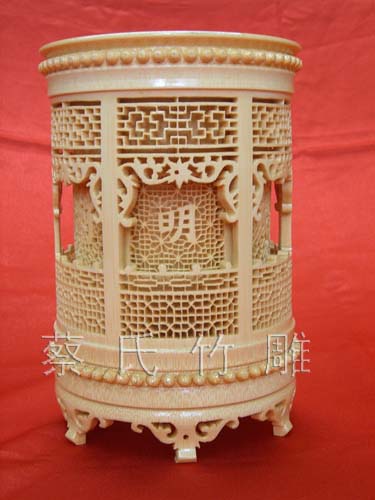 竹雕,是中华民族文化艺术宝库中璀璨的名珠,千百年来悠久的历史进程,给后人留下了精湛绝伦的艺术精品,也造就了历代众多的竹雕匠师. 蔡氏竹雕系列工艺品是江西靖安雕刻精品厂设计并生产的手工艺品,作品荣获中国竹文化节暨国际竹业博览会第二、三、四届金奖等全国大奖二十余项和多项国家专利,先后销往欧美和东南亚十几个国家和地区,并被当作国宾礼品馈赠给外国元首和国际友人,1999年本厂成功为昆明世博园设计制作大型竹吊灯,获得了国内外人士的普遍赞誉.中央电视台、江西卫视、南昌电视台、湖南卫视、宜春电视台、江西日报、中国书画报等媒体对蔡氏竹雕作过多次专题报道和推介,是江西著名的一种特色文化艺术品.蔡氏竹雕的发展得到了各级领导的关怀与帮助,2007年全国两会期间江西省委孟书记在中央电视台“小崔会客”栏目中推介蔡氏竹雕产品,对蔡氏竹雕高度赞誉。蔡氏竹雕创始人蔡煜远现为中国民间文艺家协会会员、江西省工艺美术学会会员。 特色产品镂空雕笔筒,分单层、双层和三层,采用独特的镂空技法法,经十七道工序手工刻制而成.作品创意来源于古代建筑艺术,造型取法古代亭台楼阁之门窗、回廊、护拦等,图案衍化于中国古代吉祥图案、几何图案、秀织图案等,寓意吉祥,充分体现空灵、精巧、精微、玲珑剔透之艺术特独色.极具观赏装饰和收藏价值. 竹根雕作品风格各异,因材取势,随势象形,各具情态,刀法精练、线条流畅,作品注重天人合一,形神兼备。大件的作品古色古香极具装饰趣味;小件则既可装饰又可把玩,是常置案头的文房雅玩,经手把玩久之则似得人之灵气,愈加润泽,质感温和,更具神采。深受国内外宾客和艺术品收藏者的喜爱. 留青雕作品主要是竹刻插屏,此插屏由中国传统文房用品臂搁演化而来,精美的留青作品从木架上取下即为臂搁。臂搁为作书绘画时枕臂之用,也可镇纸。是书案重要饰物,富书卷气。常置案头,日夕磨挲,历时愈久,愈摸愈润,竹肌将由浅黄色自然泛红,精美的嫩黄色竹皮图纹与泛红的竹肌色差将更为鲜明,越衬托出精雕细琢的夺目可爱。 蔡氏竹雕系列工艺品还有:微雕、竹灯、竹挂屏和各大小壁挂;竹简有各种古今名文如《滕王阁序》、《增广贤文》、《兰亭序》、《孙子兵法》、《三十六计》等;竹根雕有历史人物、吉祥物、仿古器皿、文房雅玩和各种艺术摆件。.......